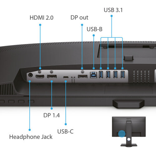 The PD2705Q features In-Plane Switching (IPS) technology, an anti-glare screen coating, 8-bit support for 16.7 million colors, a widescreen 16:9 aspect ratio, a static contrast ratio of 1000:1, a 300 cd/m2 brightness rating, 109 ppi, a Delta E 3, and a 5 ms (GtG) response time. Using the 178° horizontal and vertical viewing angles, it is possible to watch content from virtually any position. There is also one HDMI 2.0 input, one DisplayPort 1.4 input, and one DisplayPort output for daisy-chaining multiple displays together using MST (multi-stream transport) technology. Additional connectivity includes four USB-A ports, one USB Type-B port, and one USB-C port that supports DisplayPort, data transfers, and up to 65W of power. Audio can be output using the dual integrated 2W speakers or the 3.5mm headphone jack.